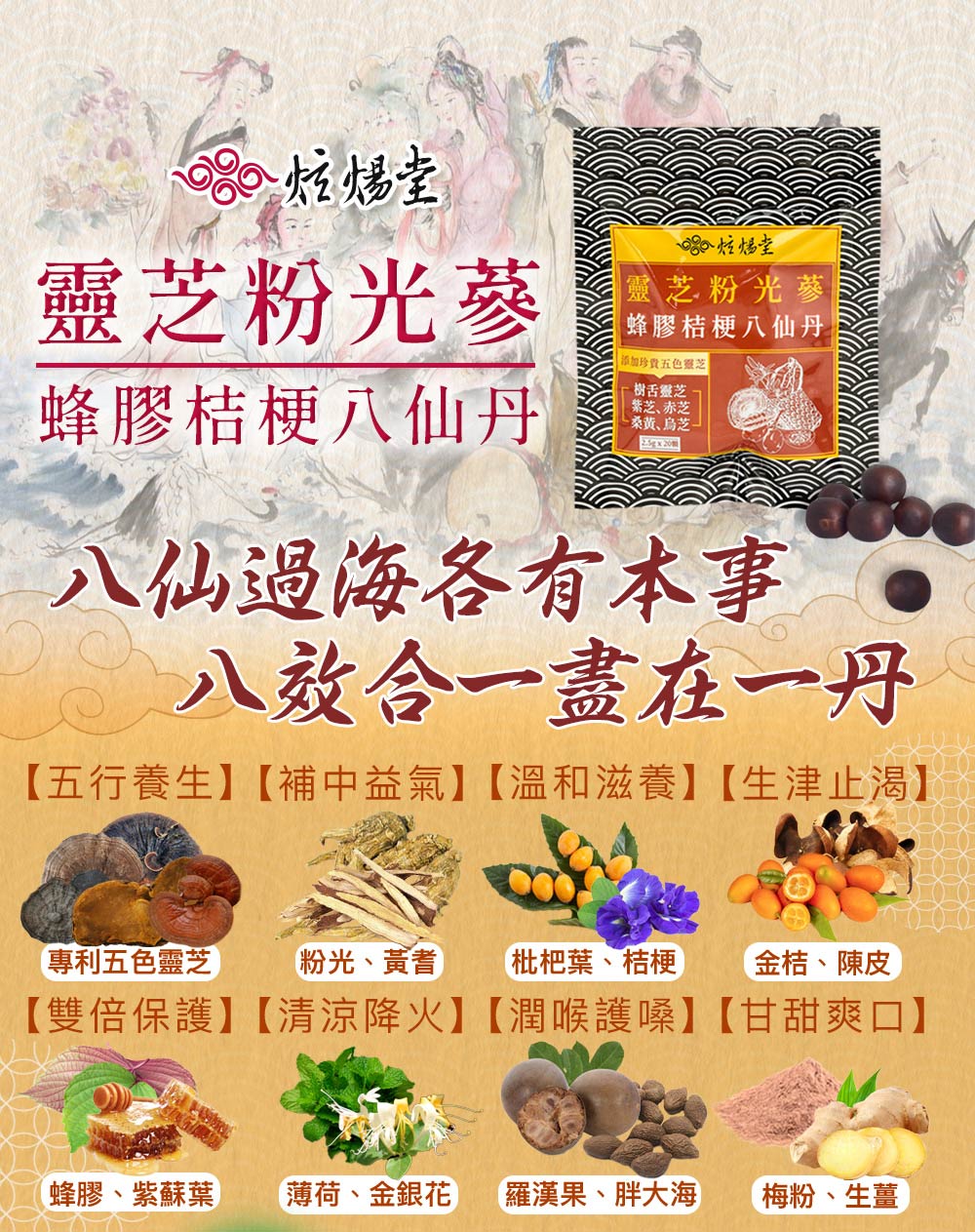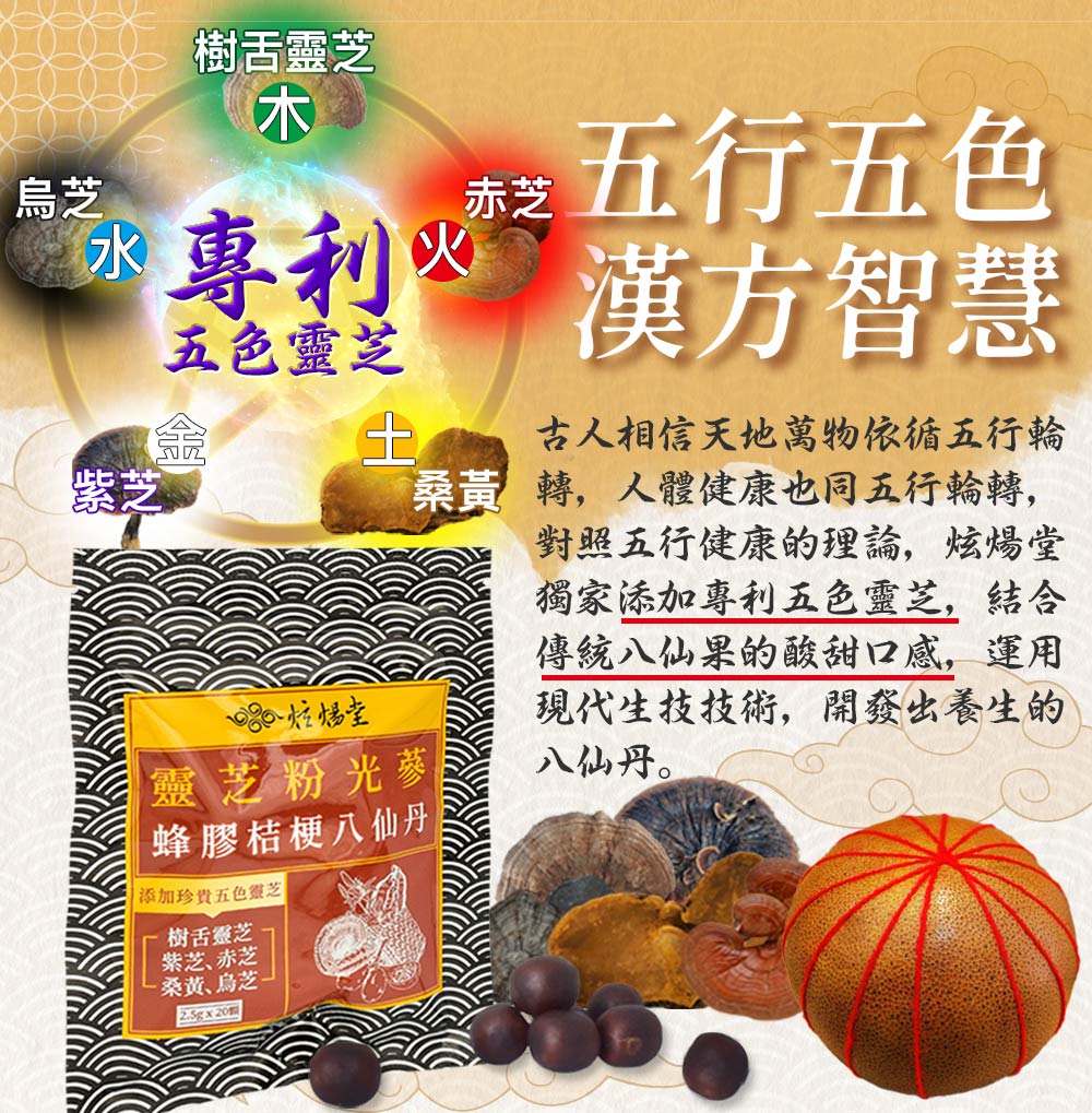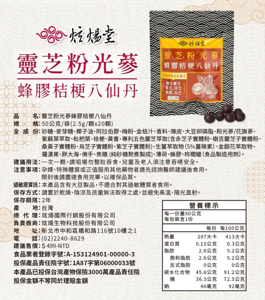 新品上市!!【炫煬堂】靈芝粉光蔘蜂膠桔梗八仙丹(2.5g X20顆/袋)